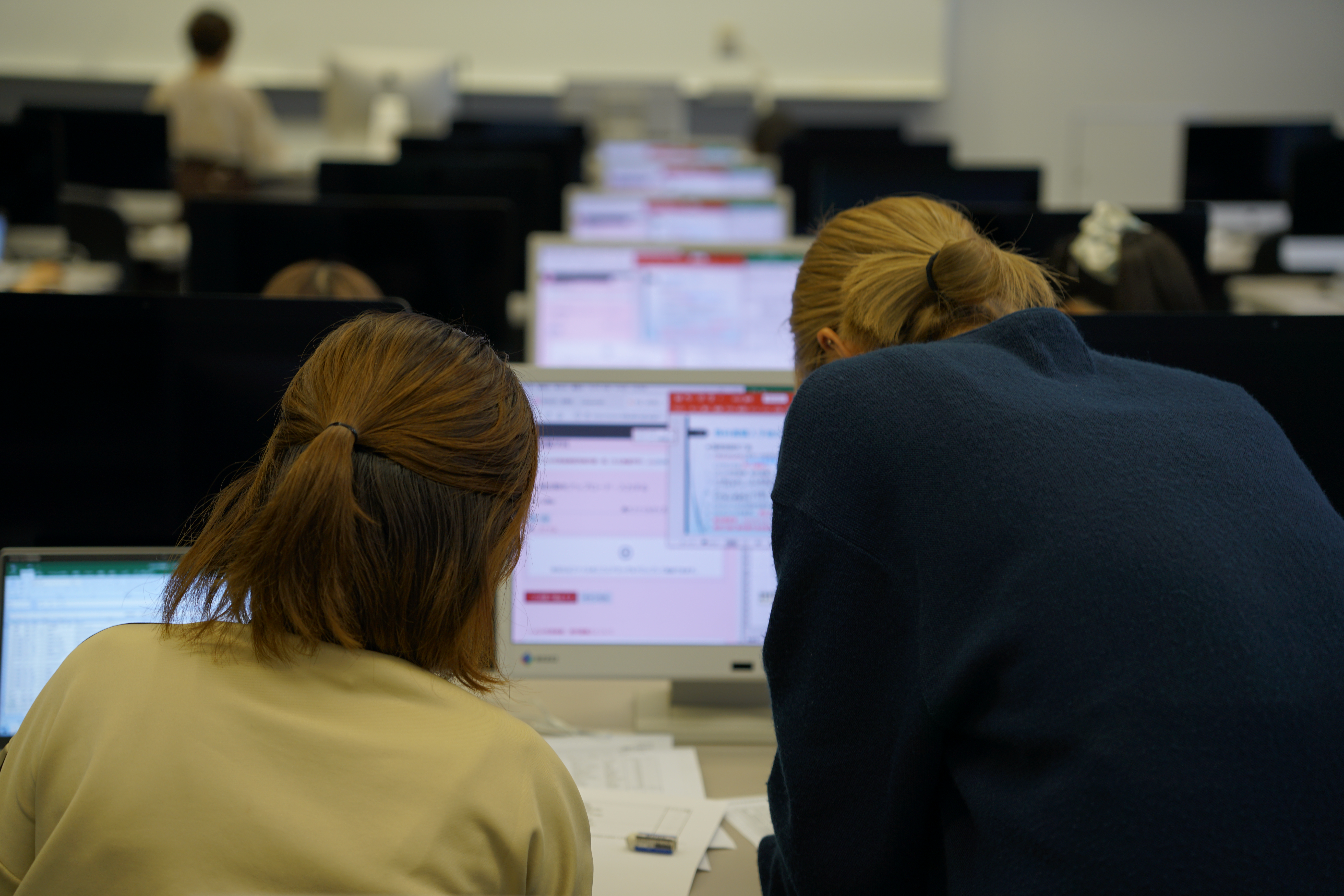 インターネットに接続されたパソコンやiPadを利用した演習を通して、適切な情報収集と発信方法を習得し、情報処理をビジネスに応用するための技能と知識を身に付けることができます。
