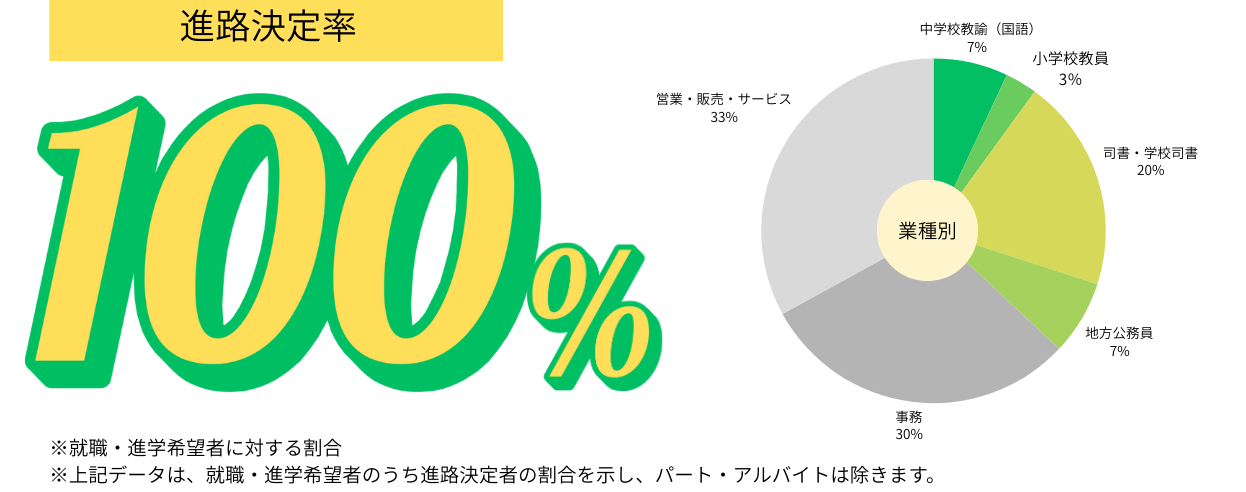 | 司書・学校司書採用実績6名 参考:2023年度全国短大新卒司書実績36名 福岡県教員採用試験合格1名 参考:2023年度全国短大新卒中学校教諭実績18名 地方公務(正)採用実績1名 参考:2023年度全国短大新卒公務員(正)実績171名 |
