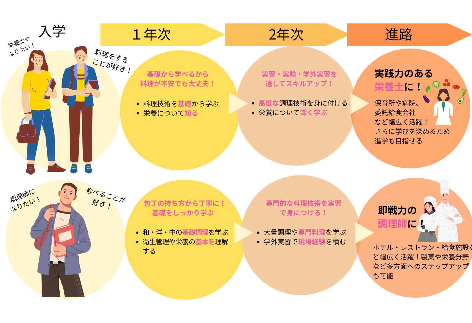 保育所や病院、給食委託会社など幅広く活躍!さらに学びを深めるため進学も目指せる!
