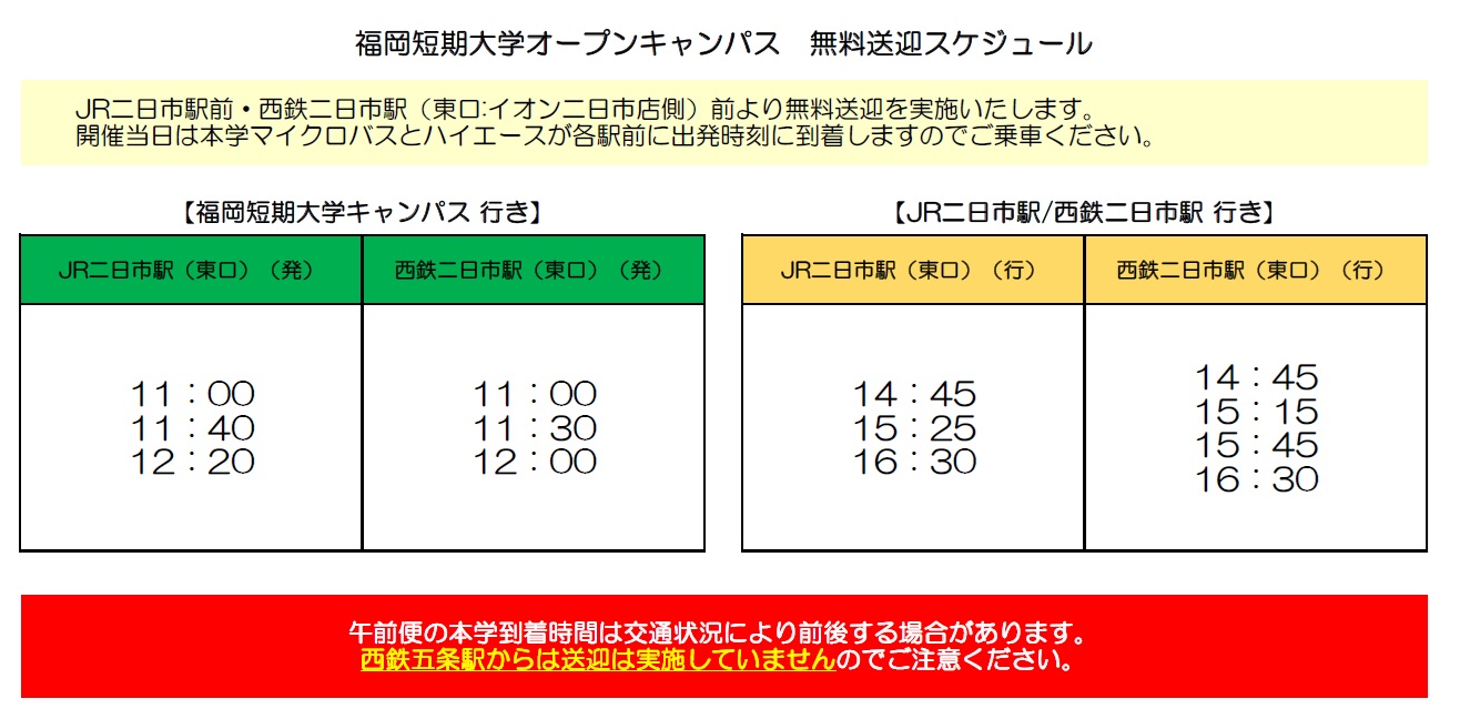 本学では、3月8日(日)・3月22日(日)「春のオープンキャンパス」に合わせて、JR二日市駅(東口)および西鉄二日市駅(東口・イオン二日市店側)より無料送迎バスを運行しております。本学のハイエース・マイクロバスが各駅前に発車時刻に到着いたしますので、時間に余裕を持ってお越しください。